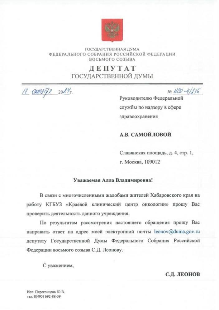 Зампред Комитета Госдумы по охране здоровья от ЛДПР Сергей Леонов отреагировал на многочисленные обращения хабаровчан, связанные с деятельностью краевого онкодиспансера, где, как пишут избиратели, «издеваются над пациентами»